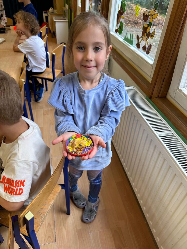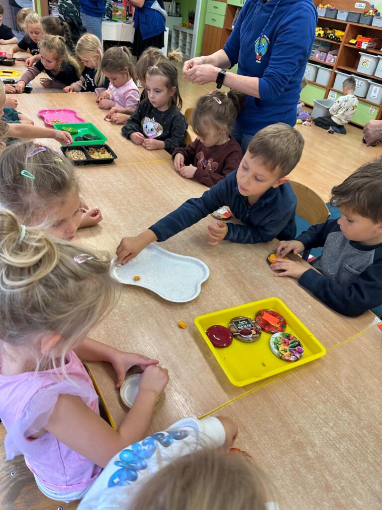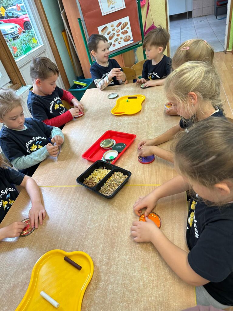 Po powrocie do naszego przedszkola dzieci zjadły podwieczorek, a następnie wykonały „Zbożową mandalę” wykorzystując do tego ziarno różnych zbóż, makaron, plastelinę. Praca plastyczna była podsumowaniem wiedzy i wrażeń ze wspólnej wycieczki do „Domu Chleba” w Tanowie.