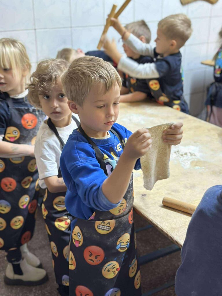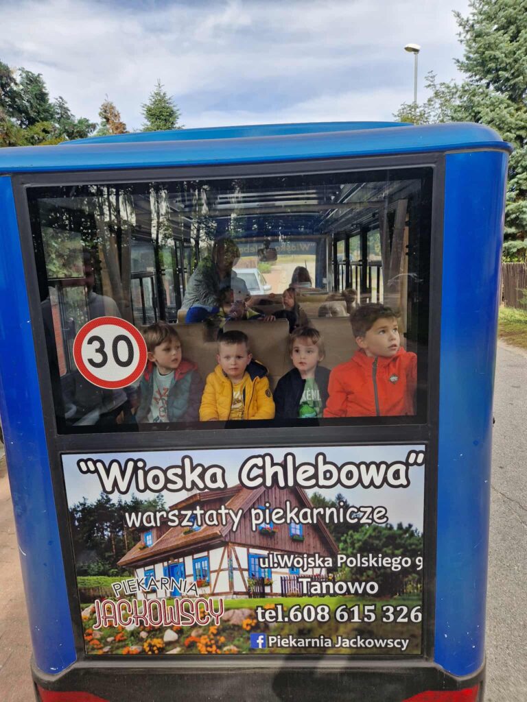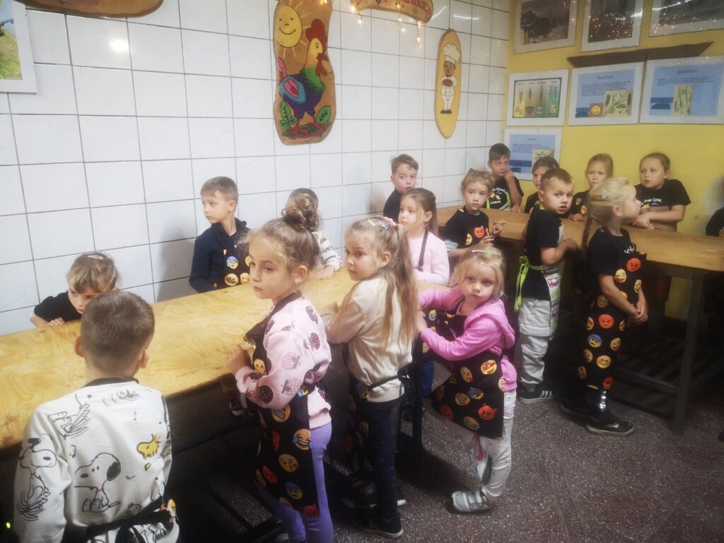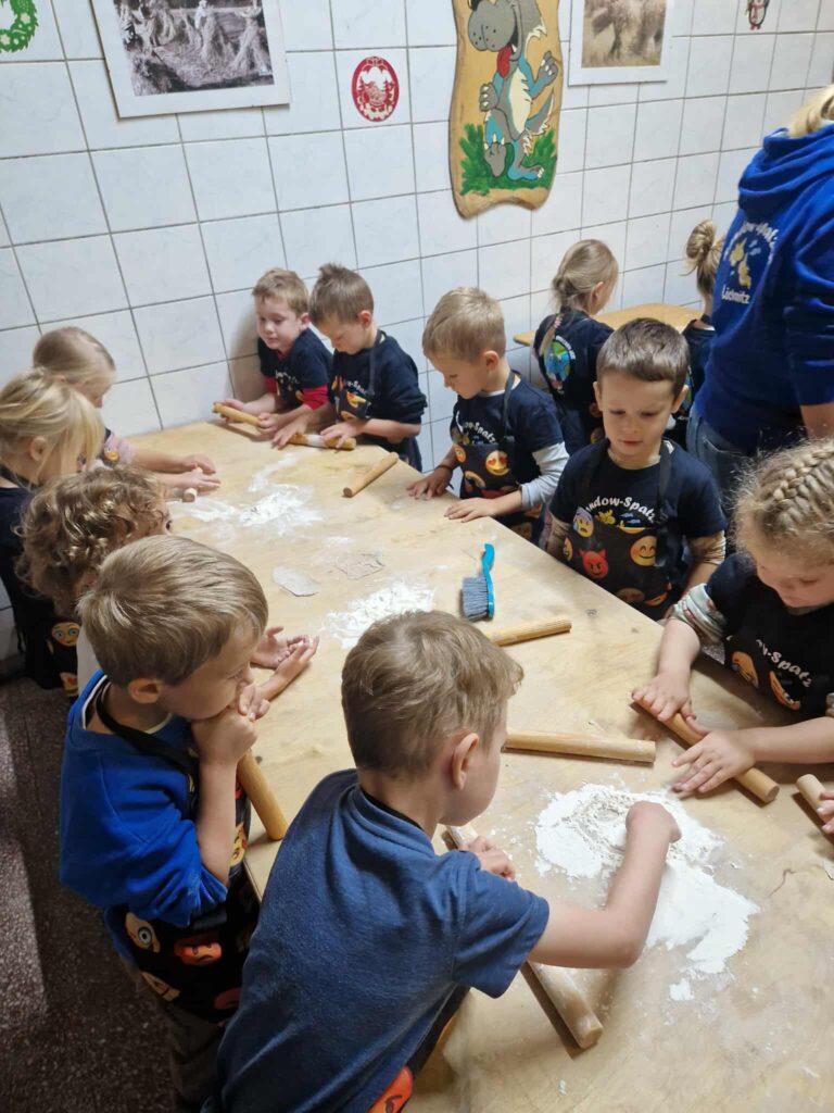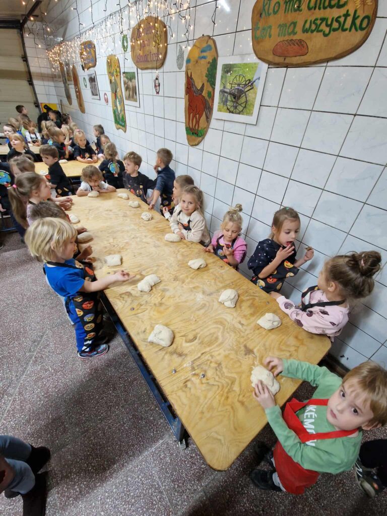 Dzieci bawiły się wyśmienicie wyrabiając z ciasta podpłomyki, bułki, chleb, pierniki. W przerwie zajęć odbyła się przejażdżka elektrycznym busem po okolicy.