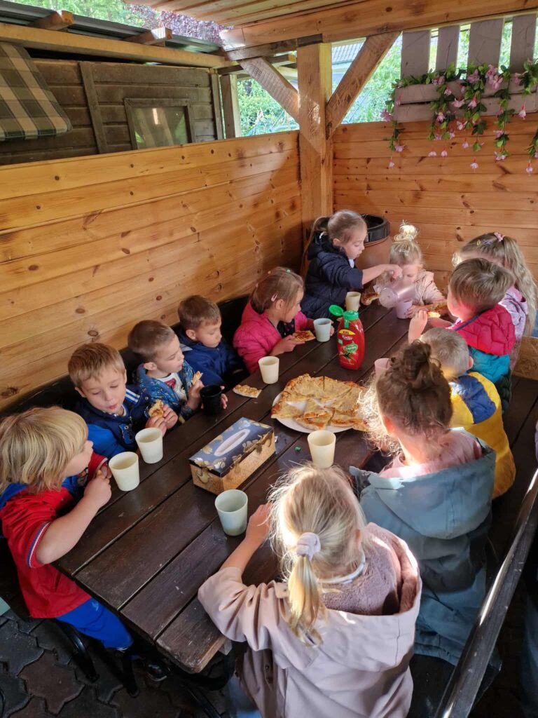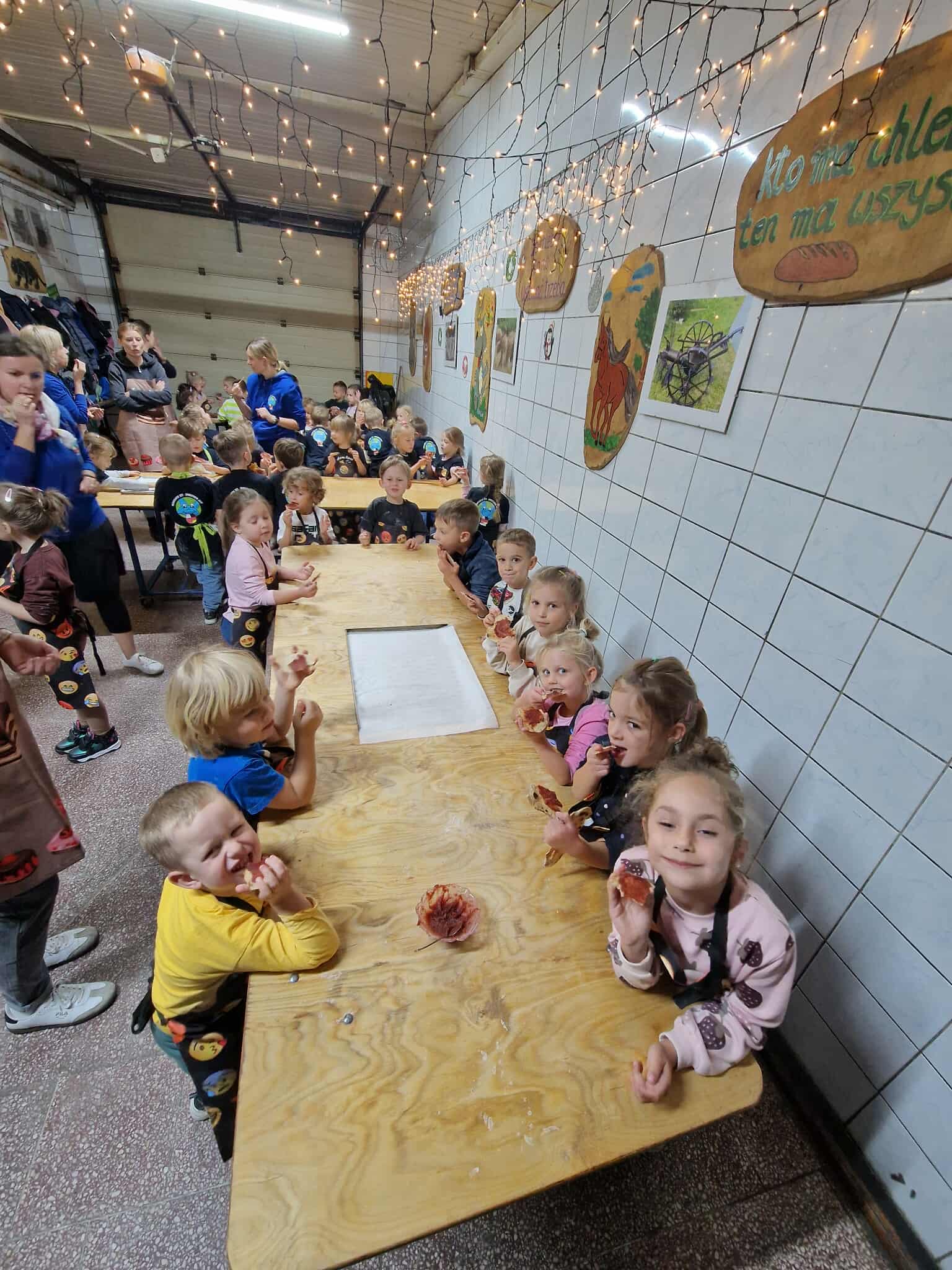 Spotkanie zakończyło się wspólnym posiłkiem pizzy pieczonej na miejscu w piekarni. Dzięki tym zajęciom przedszkolaki poznały tajniki pieczenia chleba oraz zawód piekarza.